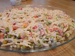 yarım paket mesela) makarna gibi haşlıyoruz, 4-5 salatalık kabukları ile rendeleniyor, içine az mayonez eklediğimiz yoğurtla hepsi karıştırılıyor.